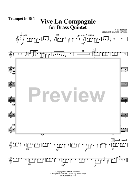 Digital Sheet Music for Vive La Compagnie - Trumpet 1 by F. D. Benteen, John Beyrent scored for Brass Quintet; id:311818