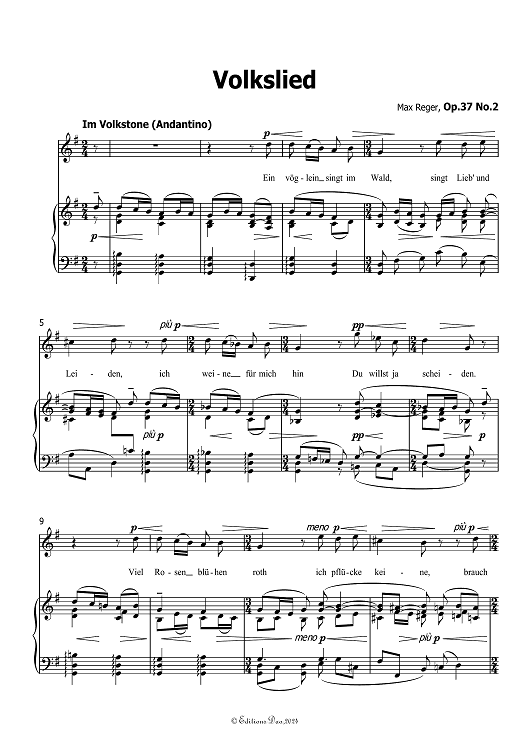 "Volkslied, Op. 37, No. 2" Sheet Music by Max Reger