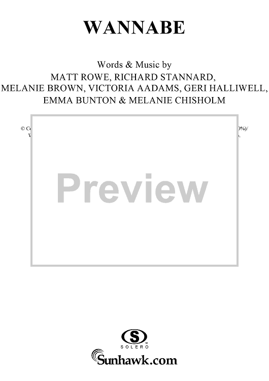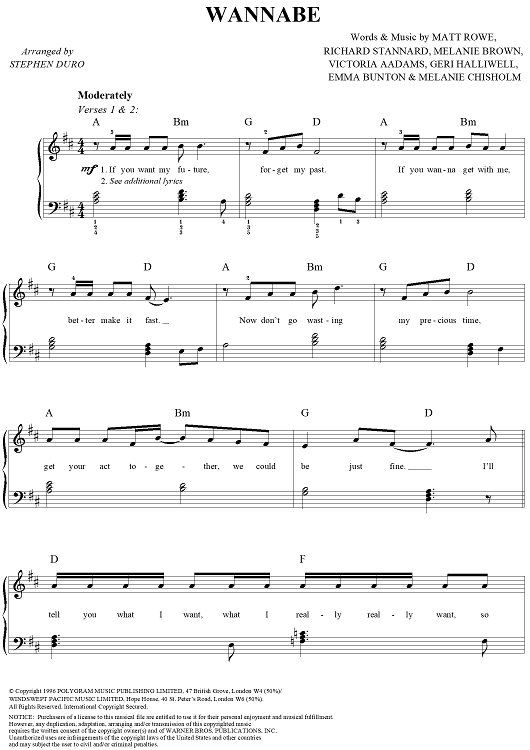 Digital Sheet Music for Wannabe by Emma Bunton, Victoria Addams, Melanie Brown, Mel C, Geri Halliwell, Matt Rowe, Richard Stannard, Stephen Duro, Spice Girls scored for Easy Piano/Vocal; id:215707
