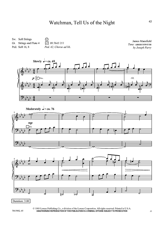 Digital Sheet Music for Watchman, Tell Us of the Night by James Mansfield, Joseph Parry scored for Organ Solo; id:437838