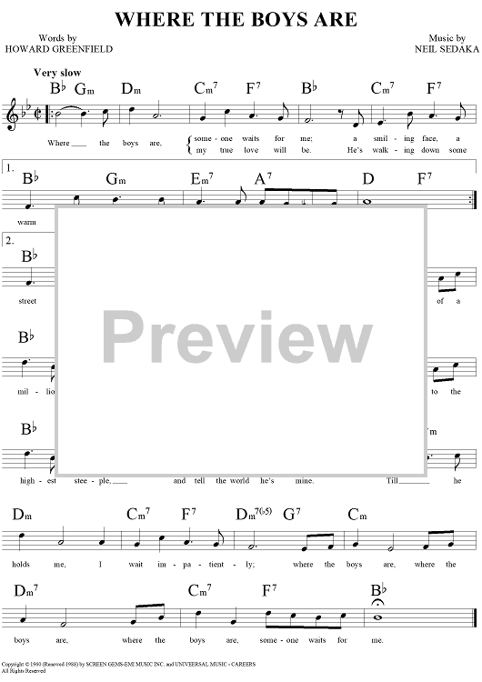 Digital Sheet Music for Where the Boys Are by Neil Sedaka, Connie Francis, Howard Greenfield scored for Lead Sheet; id:112289