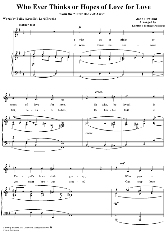 Digital Sheet Music for Who ever thinks or hopes of love for love by John Dowland, Lord Brooke Fulke Greville, Rev. Edmund Horace Fellowes scored for Voice/Piano; id:118364