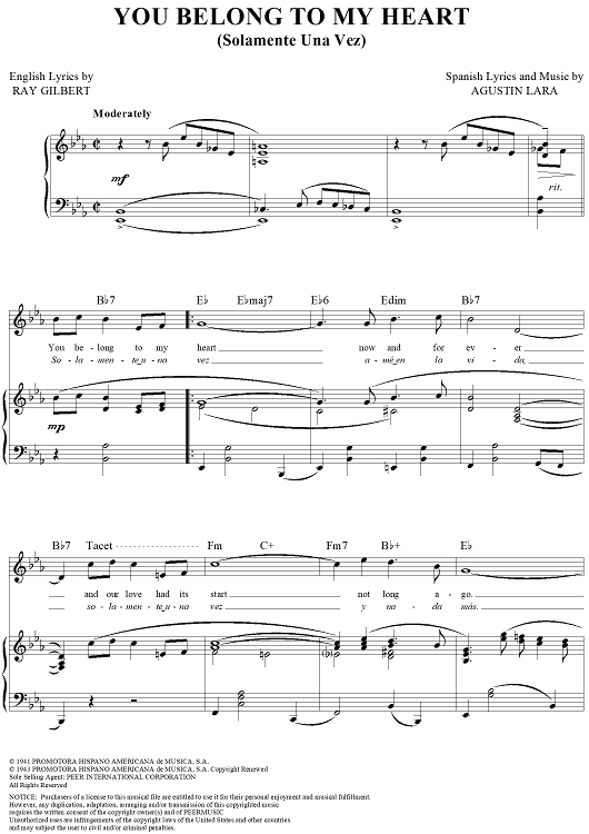"You Belong to My Heart (Solamente Una Vez)" Sheet Music by Agustin Lara