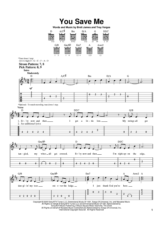 Digital Sheet Music for You Save Me by Kenny Chesney, Brett James, Troy Verges scored for Easy Guitar Tab; id:396081