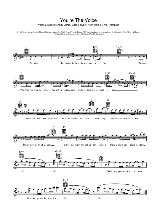 Digital Sheet Music for You're The Voice by Chris Thompson, Keith Reid, Andy Qunta, Maggie Ryder, John Farnham scored for Lead Sheet; id:401845