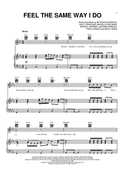 Digital Sheet Music for Feel The Same Way I Do by Rodney Jerkins, Destiny's Child, Beyonce, LaShawn Daniels, Fred Jerkins III, Kelly Rowland, Ricky Lewis, Michelle Williams scored for Piano/Vocal/Chords; id:390501