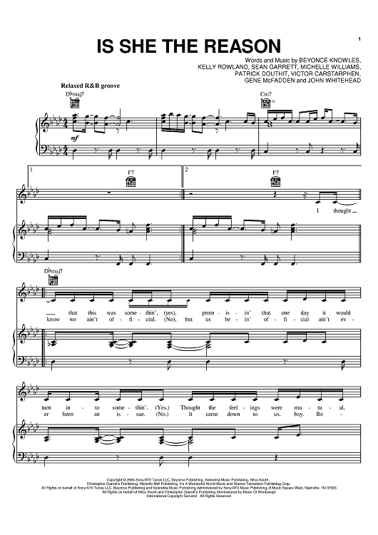 Digital Sheet Music for Is She The Reason by Destiny's Child, Beyonce, John Whitehead, Gene McFadden, Kelly Rowland, Sean Garrett, Victor Carstarphen, Patrick Douthit, Michelle Williams scored for Piano/Vocal/Chords; id:383858