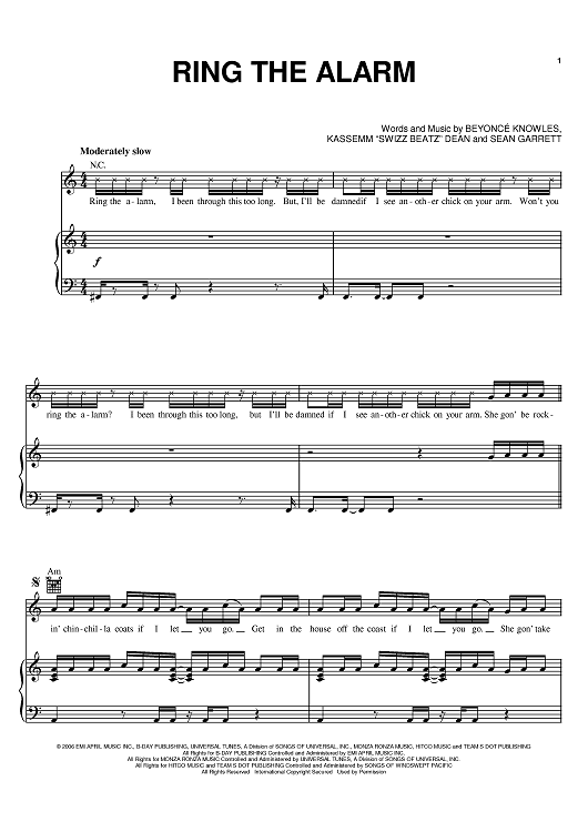 Digital Sheet Music for Ring The Alarm by Beyonce, Sean Garrett, Swizz Beatz scored for Piano/Vocal/Chords; id:396328