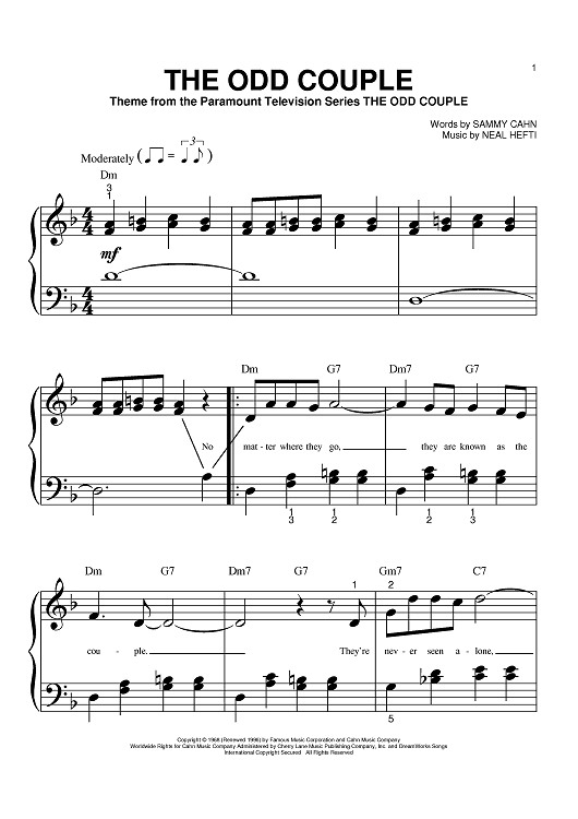 "The Odd Couple" Sheet Music by Sammy Cahn