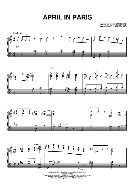 Digital Sheet Music for April In Paris by Count Basie, Billie Holiday, E.Y. "Yip" Harburg, Vernon Duke, Coleman Hawkins, Modernaires scored for Piano; id:386279