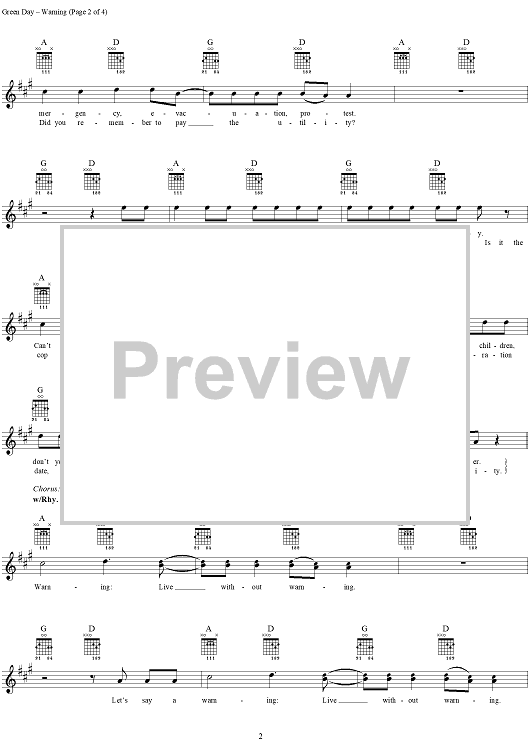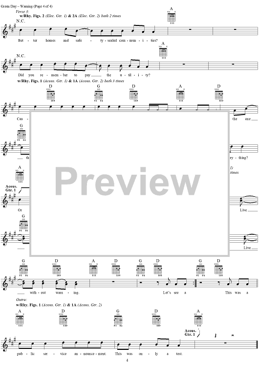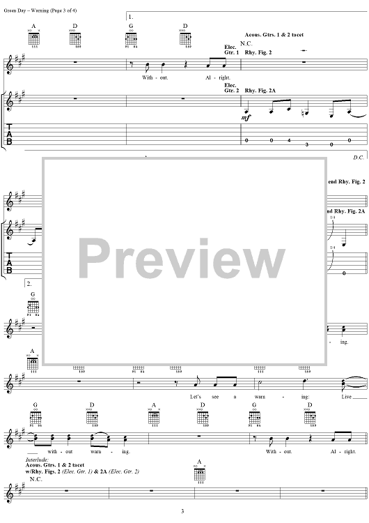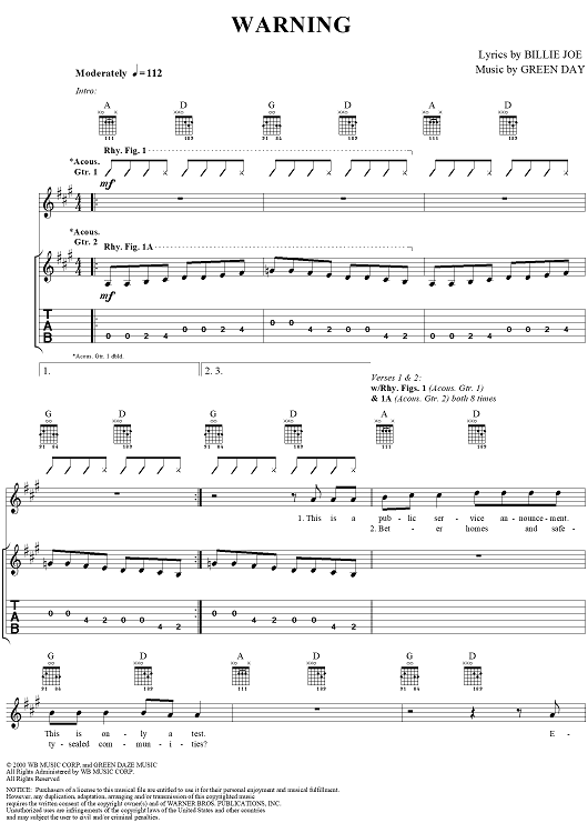 Digital Sheet Music for Warning by Green Day, Billie Joe scored for Guitar Tab/Vocal; id:285813
