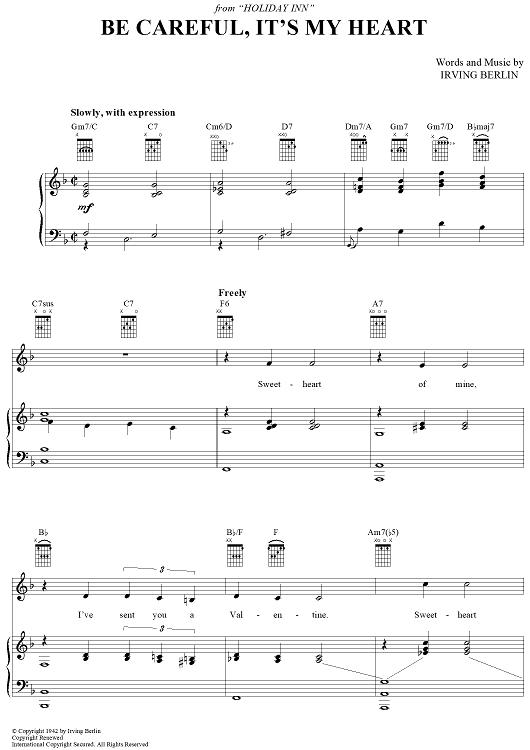 Digital Sheet Music for Be Careful, It's My Heart by Frank Sinatra, Irving Berlin, Bing Crosby scored for Piano/Vocal/Chords; id:367189