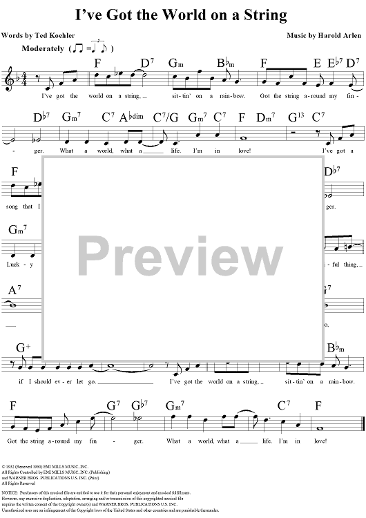 Digital Sheet Music for I've Got the World On A String by Harold Arlen, Frank Sinatra, Bing Crosby, Ted Koehler, Cab Calloway, Michael Buble, Dick Hyman scored for Lead Sheet; id:109242