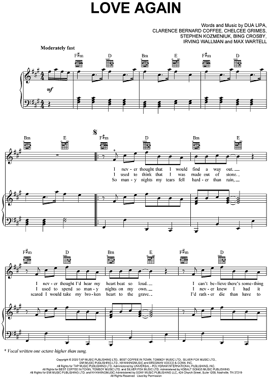 Digital Sheet Music for Love Again by Bing Crosby, Clarence Coffee Jr., Dua Lipa, Stephen Kozmeniuk, Chelcee Grimes, Irving Wallman, Max Wartell scored for Piano/Vocal/Chords; id:469395