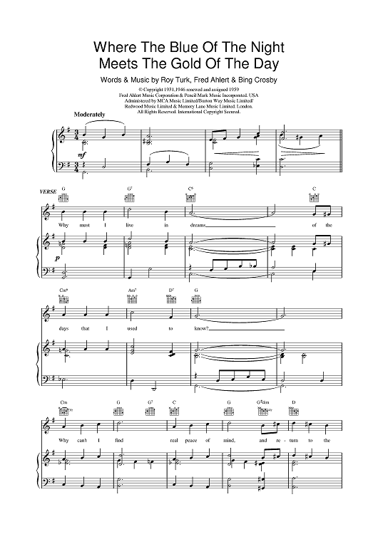 Digital Sheet Music for Where The Blue Of The Night Meets The Gold Of The Day by Bing Crosby, Fred Ahlert, Roy Turk scored for Piano/Vocal/Chords; id:379645