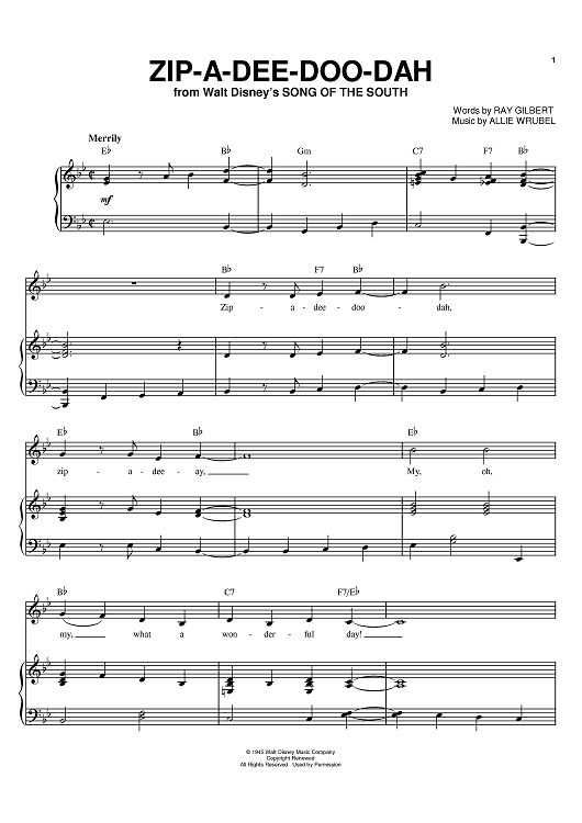 Digital Sheet Music for Zip-A-Dee-Doo-Dah by Johnny Mercer, Bing Crosby, Ray Gilbert, Allie Wrubel, James Baskett scored for Piano/Vocal/Chords; id:379330