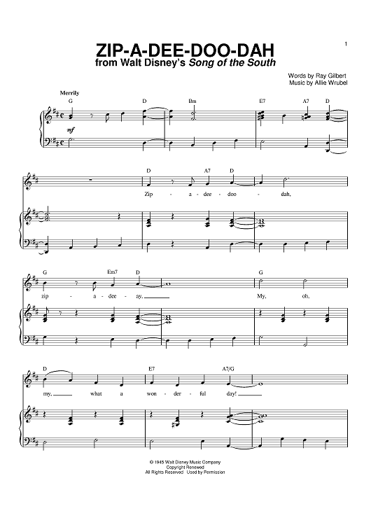 Digital Sheet Music for Zip-A-Dee-Doo-Dah by Bing Crosby, Ray Gilbert, Allie Wrubel, James Baskett, Bob B. Soxx & the Blue Jeans scored for Piano/Vocal/Chords; id:381239