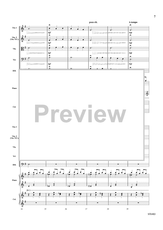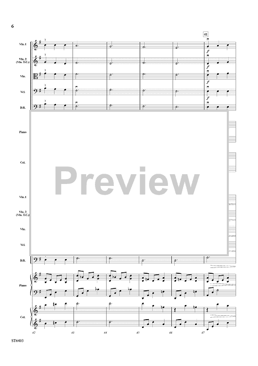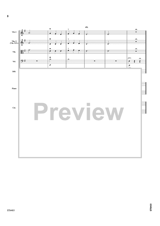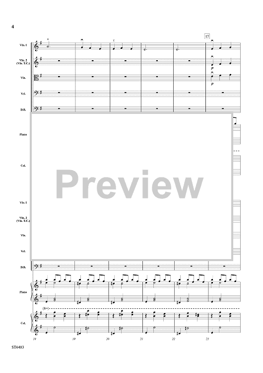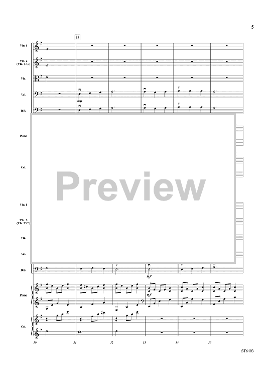 Written for the true beginner, this piece takes the listener on an eerie tour that can best be described as an unsettling experience with a touch of curiosity and anxiousness. Piano and optional celesta (playable on a keyboard) create a haunting background reminiscent of a film score. Instruments move mostly by stepwise motion and all string crossings involve an open string. No eighth notes are used, and many instruments use only 5 or 6 notes (while violin 1 uses a one octave D Major scale). Highly playable and extremely engaging! (2:00)