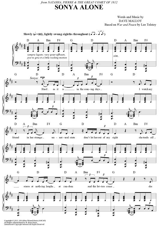 "Sonya Alone - from Natasha, Pierre & The Great Comet of 1812" Sheet Music by Dave Malloy