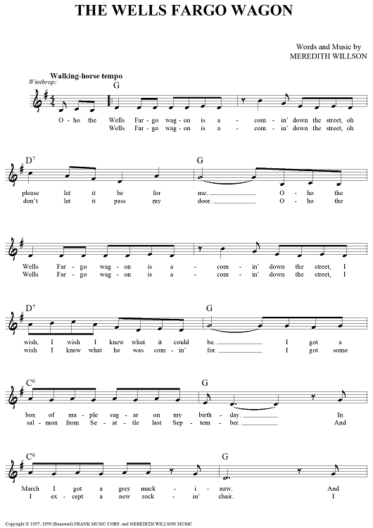 "The Wells Fargo Wagon" Sheet Music by Meredith Willson