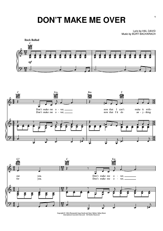 Digital Sheet Music for Don't Make Me Over by Hal David, Burt Bacharach, Dionne Warwick scored for Piano/Vocal/Chords; id:374710
