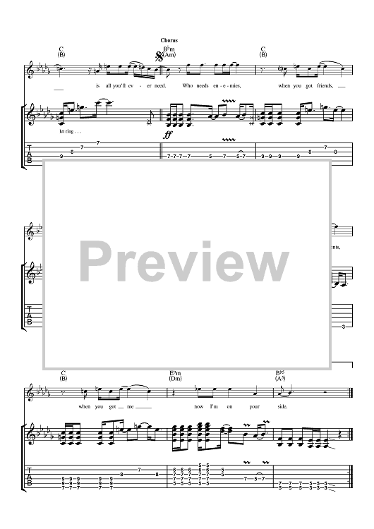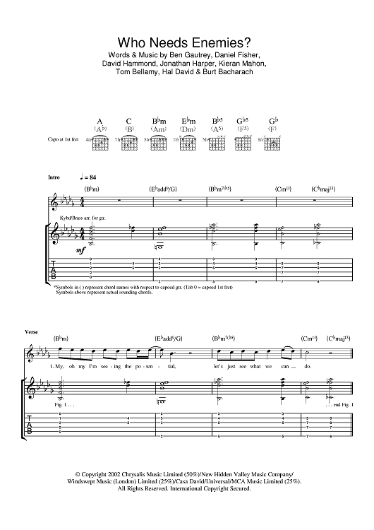 Digital Sheet Music for Who Needs Enemies? by Hal David, Burt Bacharach, Dan Fisher, The Cooper Temple Clause, Tom Bellamy, Ben Gautrey, Jon Harper, Didz Hammond scored for Guitar Tab; id:377629