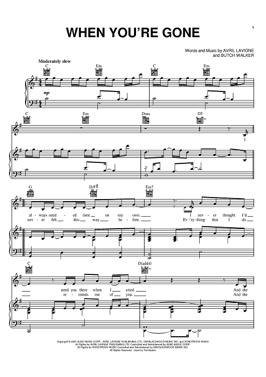 Digital Sheet Music for When You're Gone by Avril Lavigne, Butch Walker scored for Piano/Vocal/Chords; id:398163