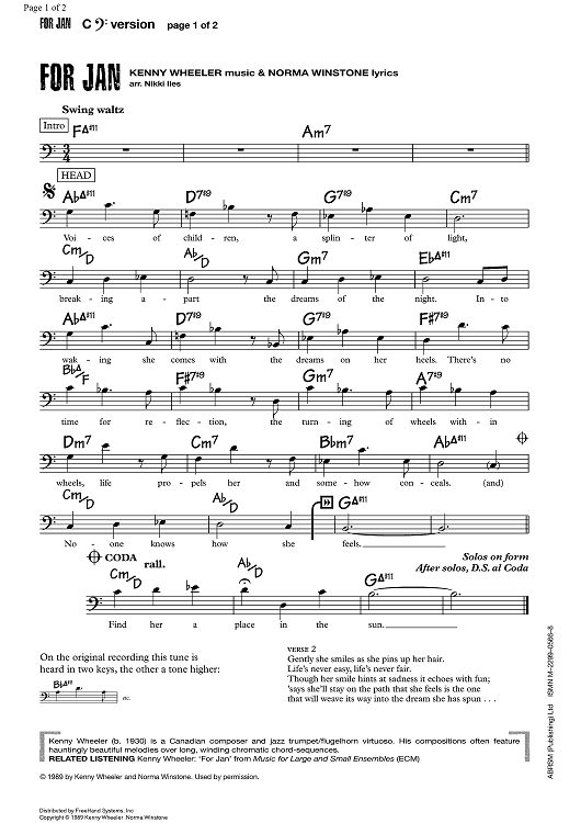 Digital Sheet Music for For Jan - C Instruments by Nikki Iles, Kenny Wheeler, Norma Winstone scored for Lead Sheet; id:355659