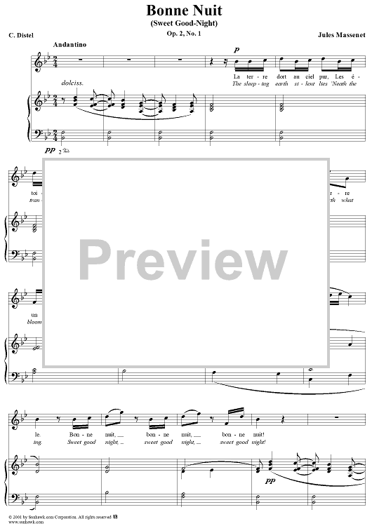 Digital Sheet Music for Bonne Nuit (Sweet Good-Night), No. 1 from "Trois mélodies" by C. Distel, Jules Massenet scored for Voice/Piano; id:251745
