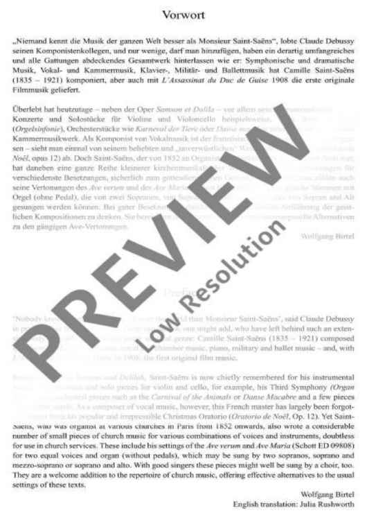 No, it is not only Mozart when hearing the Ave verum: Camille Saint-Saëns (1835-1921), too, set this text to music several times - for example, for organ (without pedal) and two identical voices. The organ may even be replaced by a piano, the vocal parts can be sung by two sopranos, soprano and mezzo-soprano, or soprano and alto. If the performers are good, one may even consider a performance of this sacred composition in groups. Now available in an attractiv single edition, this setting is valuable addition to the repertoire and impressive alternative to the common Ave settings.