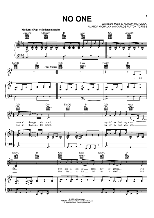 Digital Sheet Music for No One by Aly & AJ, Alyson Michalka, Amanda Joy Michalka, Carlos Platon Tornes scored for Piano/Vocal/Chords; id:384998