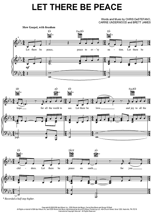 Digital Sheet Music for Let There Be Peace by Brett James, Chris DeStefano, Carrie Underwood scored for Piano/Vocal/Chords; id:468733