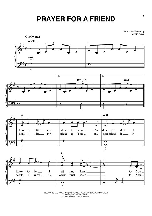 Digital Sheet Music for Prayer For A Friend by Mark Hall, Casting Crowns scored for Easy Piano; id:402369