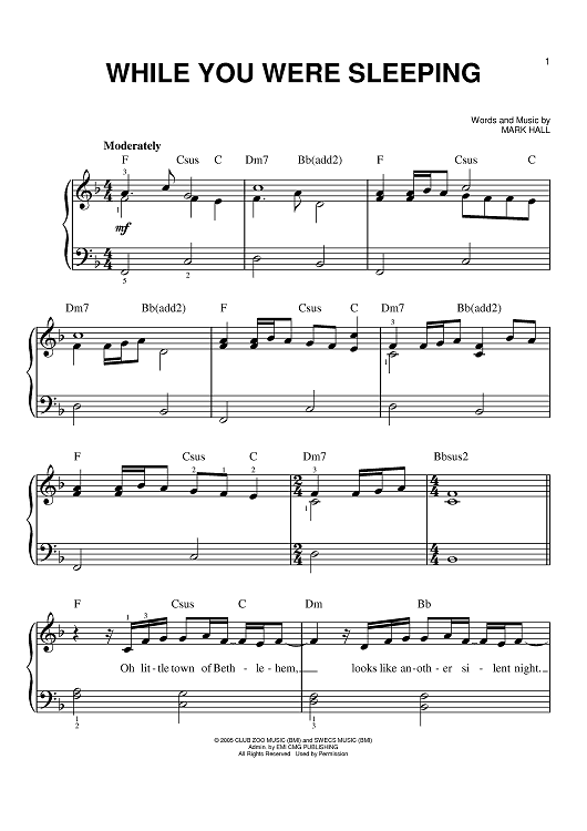Digital Sheet Music for While You Were Sleeping by Mark Hall, Casting Crowns scored for Easy Piano; id:390607