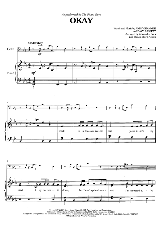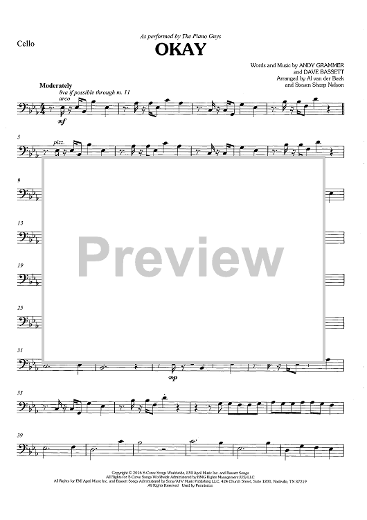 Digital Sheet Music for Okay by Dave Bassett, Al Van Der Beek, Steven Sharp Nelson, The Piano Guys, Andy Grammer scored for Cello and Piano; id:465586