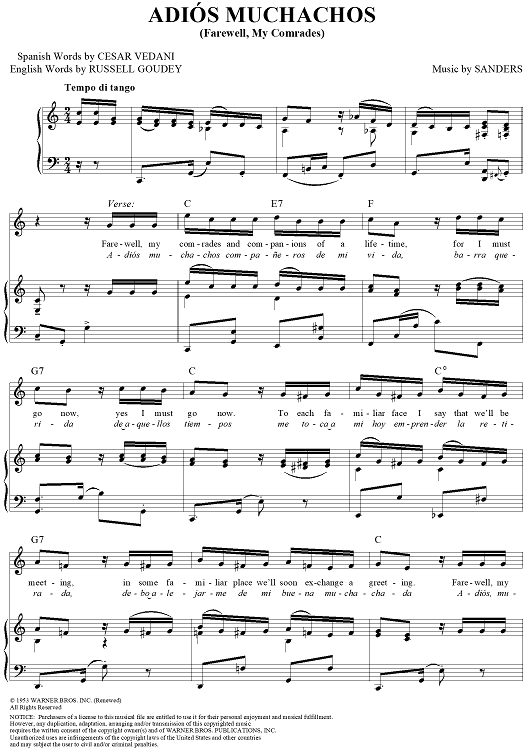 Digital Sheet Music for Adiós Muchachos (Farewell, My Comrades) by Sanders, Russell Goudey, Cesar F. Vedani scored for Piano/Vocal/Chords; id:256034
