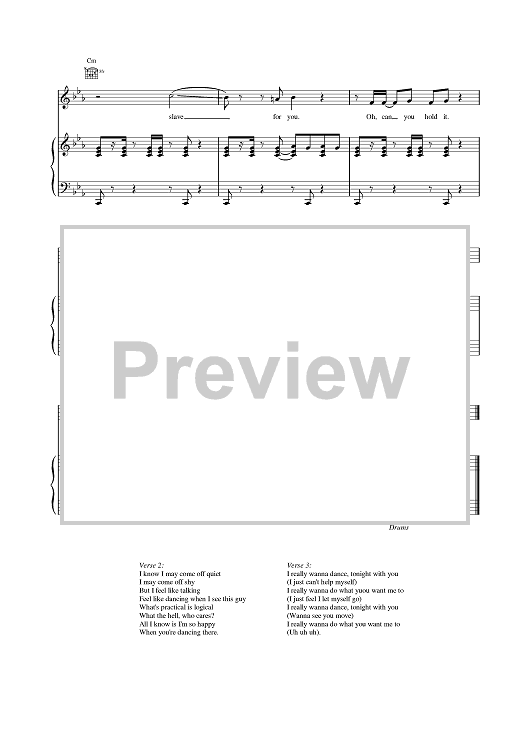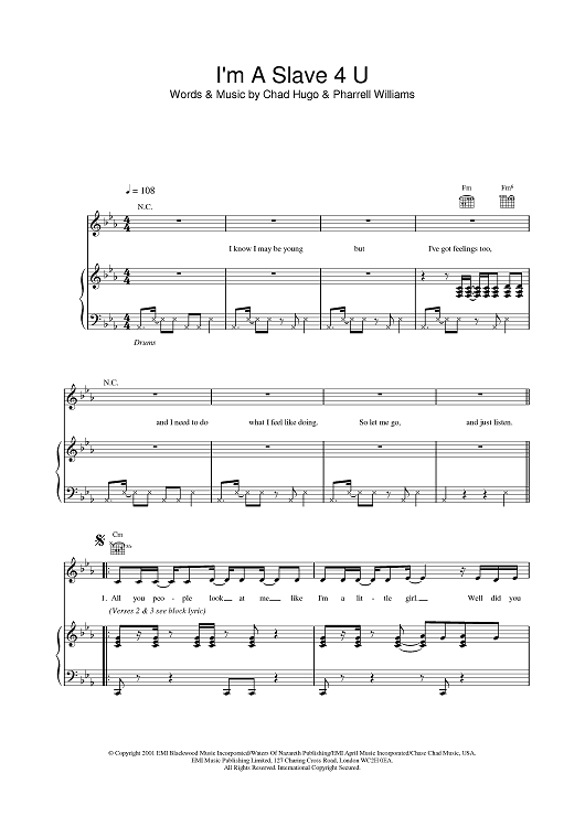 Digital Sheet Music for I'm A Slave 4 U by Chad Hugo, Pharrell Williams, Britney Spears scored for Piano/Vocal/Chords; id:380153