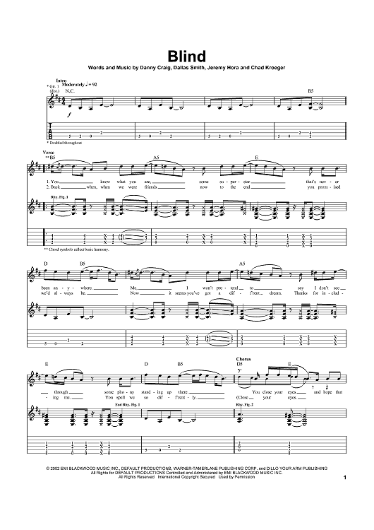 Digital Sheet Music for Blind by Chad Kroeger, Danny Craig, Default, Dallas Smith scored for Guitar Tab; id:369302