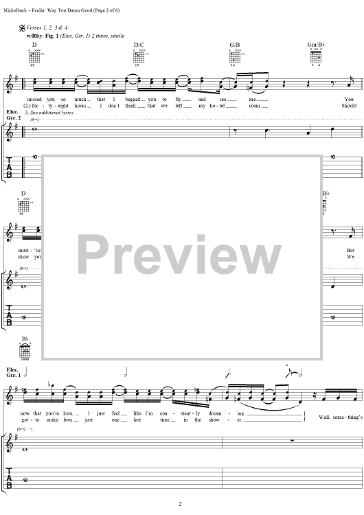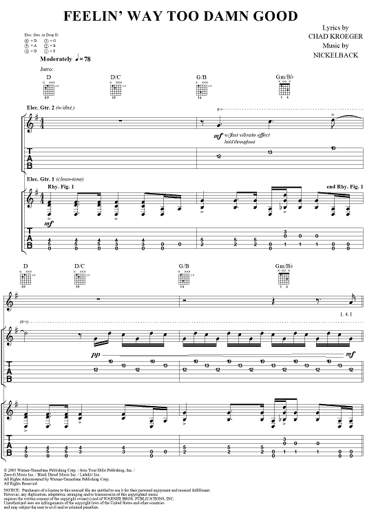 Digital Sheet Music for Feelin' Way Too Damn Good by Nickelback, Chad Kroeger scored for Guitar Tab/Vocal; id:304543