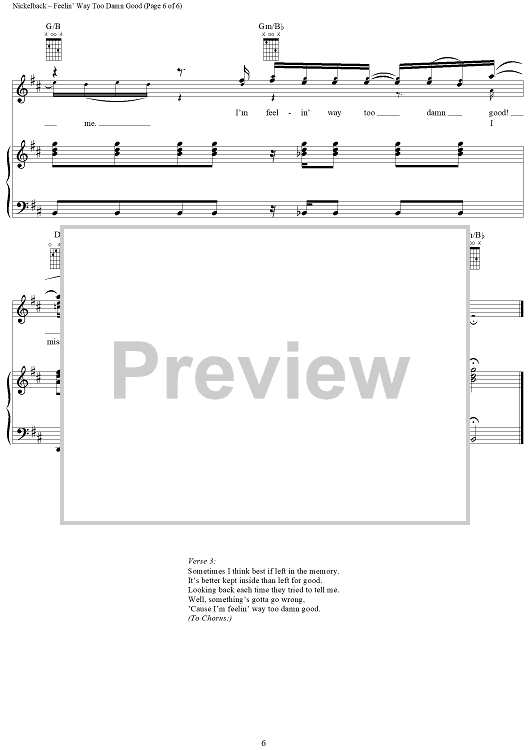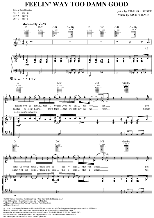 Digital Sheet Music for Feelin' Way Too Damn Good by Nickelback, Chad Kroeger scored for Piano/Vocal/Chords; id:307438