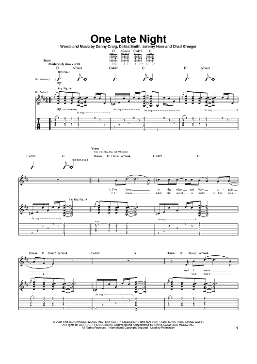 Digital Sheet Music for One Late Night by Chad Kroeger, Danny Craig, Default, Dallas Smith scored for Guitar Tab; id:367830