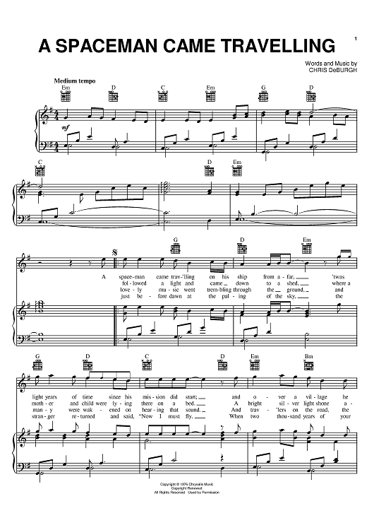 Digital Sheet Music for A Spaceman Came Travelling by Chris de Burgh scored for Piano/Vocal/Chords; id:399334