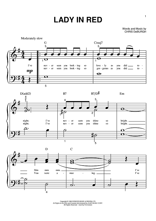 Digital Sheet Music for Lady In Red by Chris de Burgh scored for Big Note Piano; id:369327