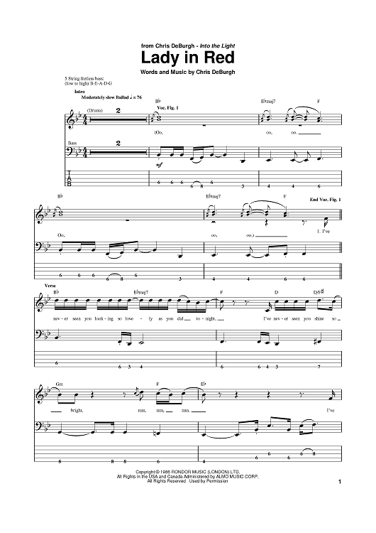 Digital Sheet Music for Lady In Red by Chris de Burgh scored for Bass Tab; id:383061