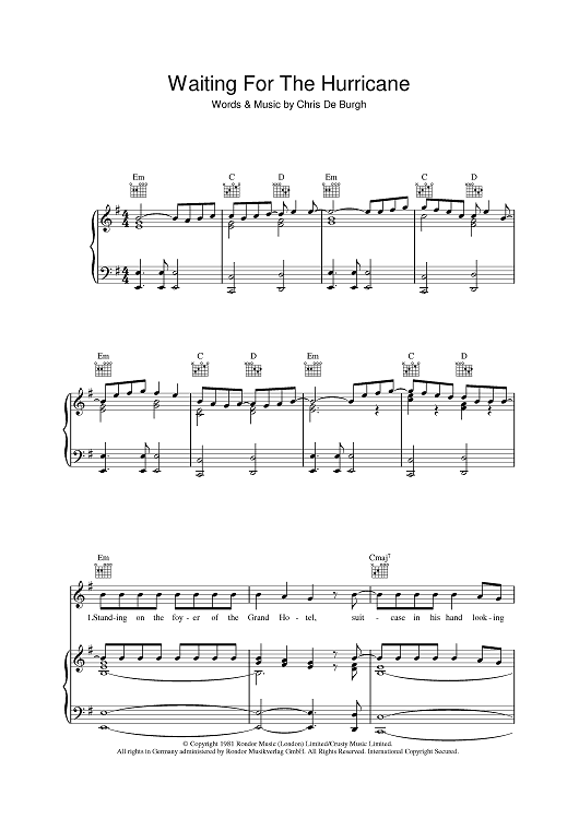 Digital Sheet Music for Waiting For The Hurricane by Chris de Burgh scored for Piano/Vocal/Chords; id:401397