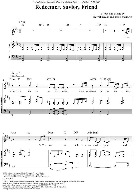 Digital Sheet Music for Redeemer, Savior, Friend by Darrell Wayne Evans, Chris Springer scored for Piano/Vocal/Chords; id:283191