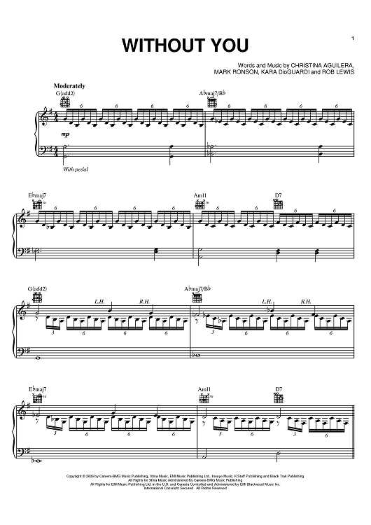 Digital Sheet Music for Without You by Kara DioGuardi, Mark Ronson, Rob Lewis, Christina Aguilera scored for Piano/Vocal/Chords; id:401717