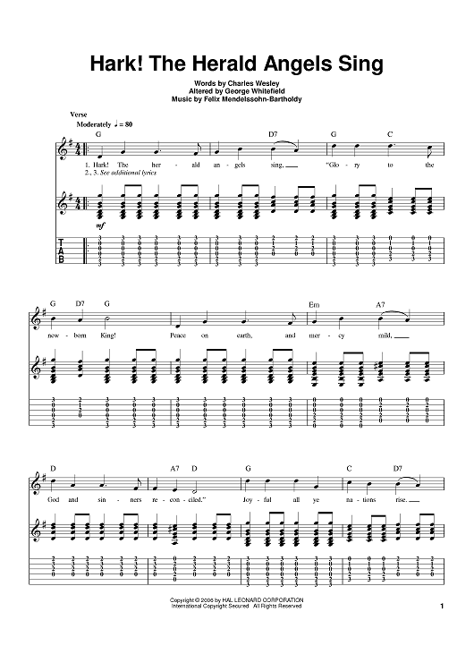Digital Sheet Music for Hark! The Herald Angels Sing by Felix Mendelssohn, Charles Wesley, William H. Cummings, George Whitefield scored for Guitar Tab; id:391221
