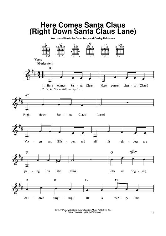 Digital Sheet Music for Here Comes Santa Claus (Right Down Santa Claus Lane) by The Carpenters, Gene Autry, Oakley Haldeman scored for Easy Guitar; id:384718