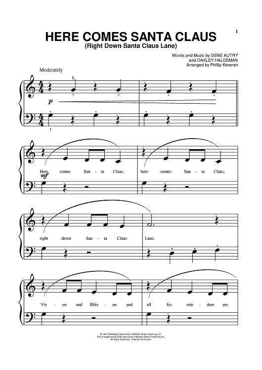 Digital Sheet Music for Here Comes Santa Claus (Right Down Santa Claus Lane) by The Carpenters, Gene Autry, Oakley Haldeman, Phillip Keveren scored for Piano; id:391461